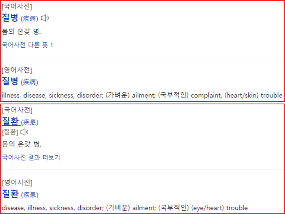 그렇다면, 질병과 질환은 차이가 없는걸까? 네이버 어학사전에는 다음과 같이 기술되어 있습니다.