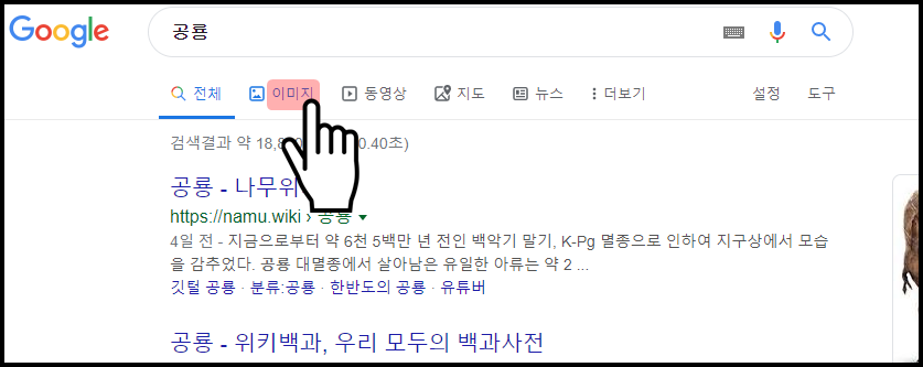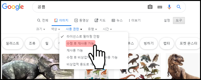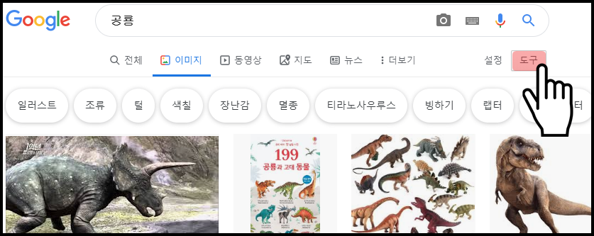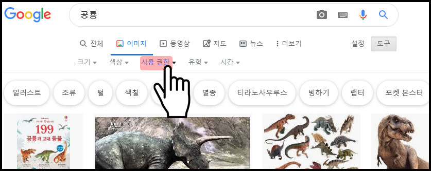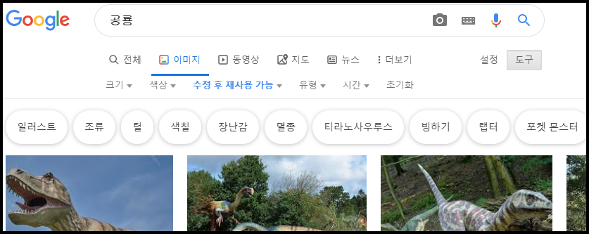 1. 구글 검색창에 원하는 이미지를 검색합니다. 저같은 경우에는 "공룡"을 검색해 보도록 할게요.