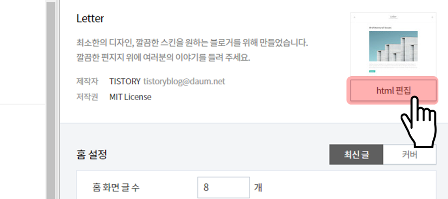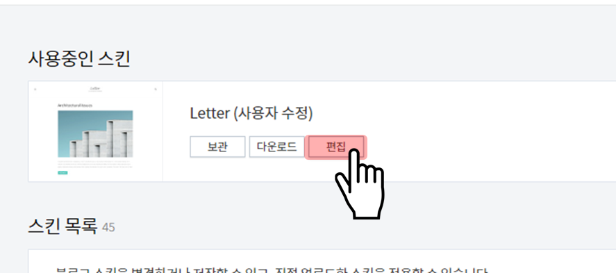 7. 현재 사용중인 스킨의 편집 버튼을 클릭해 줍니다.