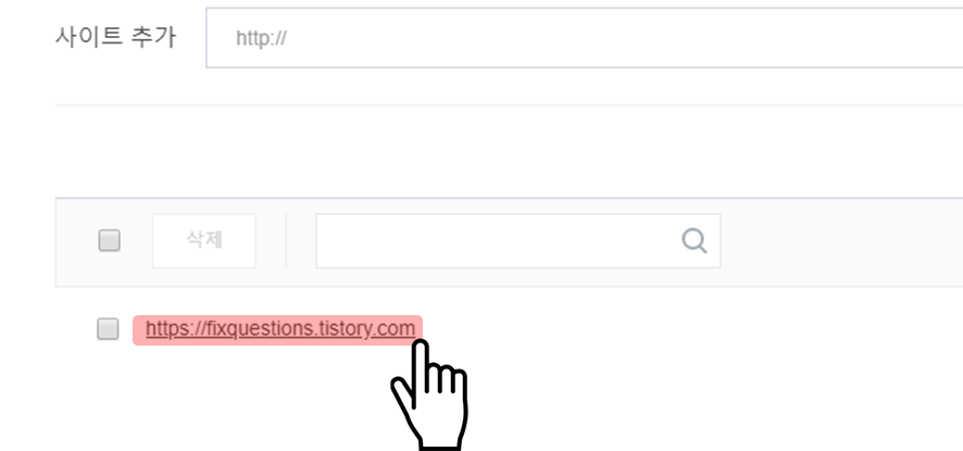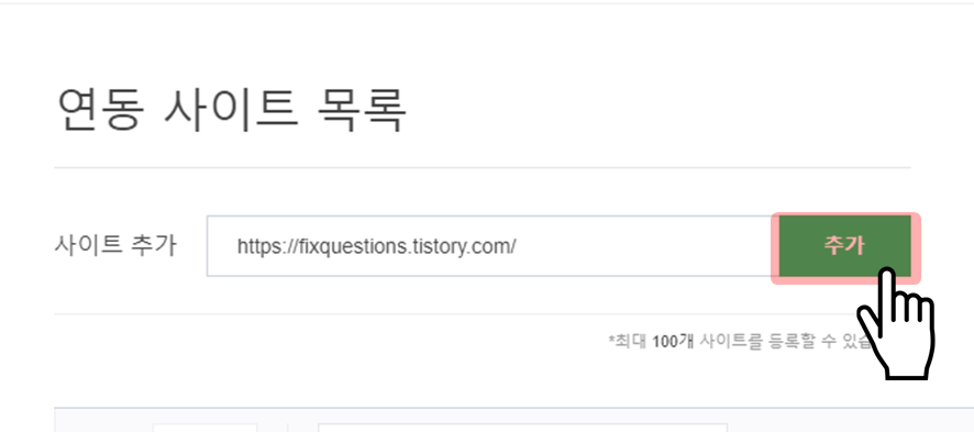 3. 웹마스터 도구를 클릭하면, 연동사이트 목록이 뜹니다. 여기에 자신의 블로그 주소를 추가해 줍니다. 저는 제 블로그주소인, https://fixquestions.tistory.com/를 추가하도록 하겠습니다. 자신의 블로그 주소를 다입력하였으면, 옆의 추가 버튼을 클릭해 줍니다.