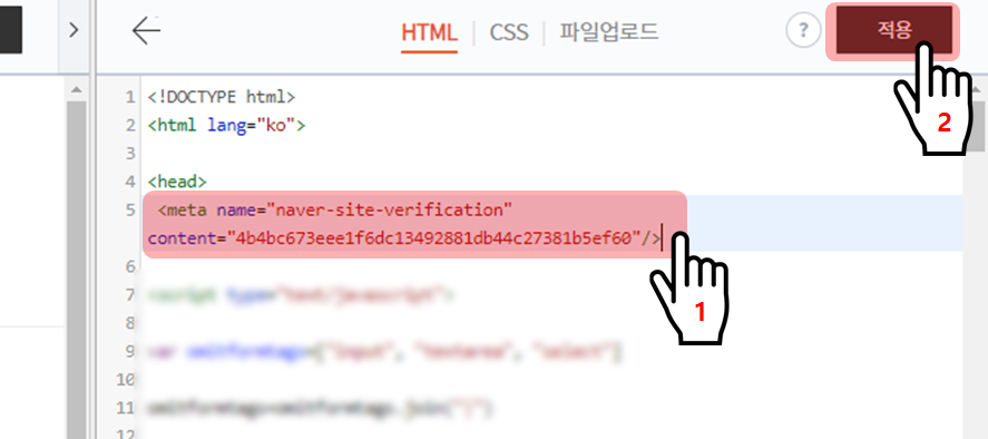 9. html 편집을 클릭하면, 우측 화면에 명령어 창이 하나 생깁니다. 이 창에서 <head> 라고 써있는 부분의 아래에, 이전의 4번 단계에서 복사한 메타태그를 붙여넣기 해줍니다. 붙여넣기가 완료된후, 적용 버튼을 클릭해 줍니다.