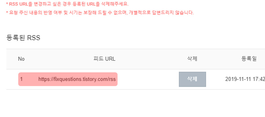 14. 확인 버튼이 클릭되면, 등록된 RSS 항목에 자신의 블로그가 등록되어있음을 확인할수 있습니다.