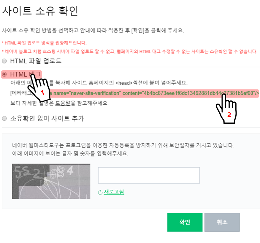 4. 본인이 추가할 사이트가 실제로, 본인 소유인지 확인하기 위한 과정입니다. 여기서 부턴 헷갈릴수 있으므로, 차근차근 따라하시면 됩니다. 먼저, HTML 태그를 클릭하여, 하단에 나타나는 메타태그를 "<에서 >까지", 즉 괄호안의 내용을 복사해 줍니다.