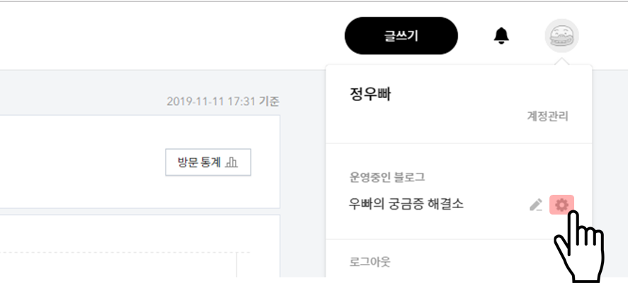 5. 네이버 창은 그대로 두고, 새로운 창을 이용하여 자신의 블로그를 만들었던 사이트로 갑니다. 저같은 경우, 티스토리에서 만들었으므로, 티스토리로 이동하겠습니다. 티스토리 창을 들어가면, 우측 상단에 톱니바뀌모양의 아이콘이 보입니다. 이것은 블로그 관리화면으로 이동하는 버튼입니다. 해당 버튼을 클릭해 줍니다.