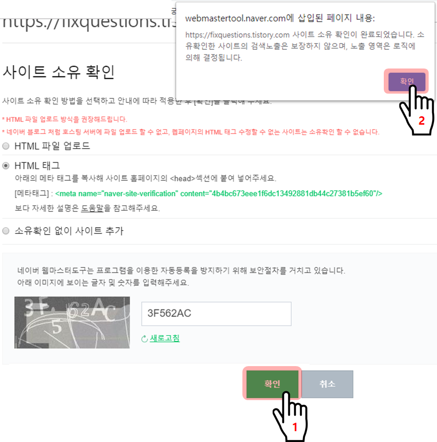 10. 이전에 메타태그를 복사했던, 네이버 창으로 돌아갑니다. 이 창에서 확인 버튼을 클릭하면, 소유 확인이 완료되었다는 창이 하나 생성됩니다. 여기서 확인 버튼을 클릭합니다.