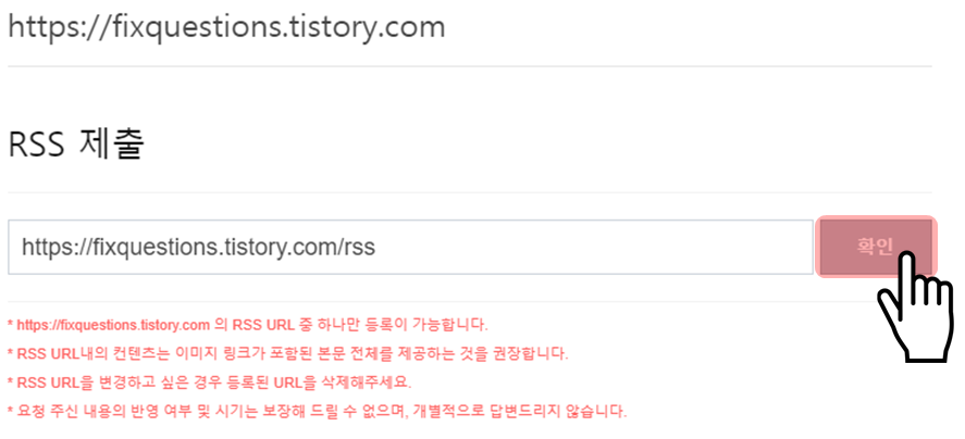 13. RSS 제출 창이 뜨는데, 이 창에 자신의 블로그 주소 + /rss를 입력해 줍니다. 그 후 확인버튼을 클릭해 줍니다.